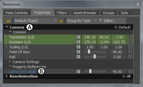 The Property References pane lets you associate one element’s properties with another element. For example, you can associate a light’s Cone Angle property with a camera. When you select the camera, a “Light.Cone angle” property displays after the camera’s properties.
