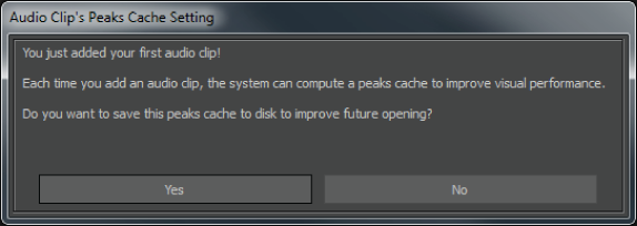 The first time you load an audio file, the Audio Clip’s Peaks Cache Setting dialog box appears, letting you save the audio cache on the hard disk.