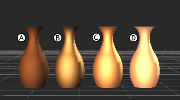 Material settings results A. Diffuse color alone B. Specular color with Diffuse C. Ambient color added to Diffuse and Specular D. Emissive color added to the result