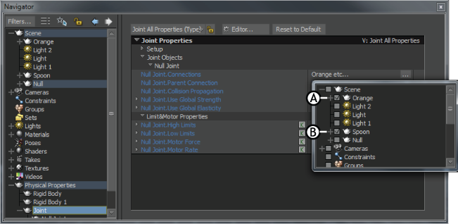 - Select Joint in the Navigator window Scene browser and expand Setup and ensure that the Joint is set to Active. Then select the affected objects in the Null Joint Connections asset list.