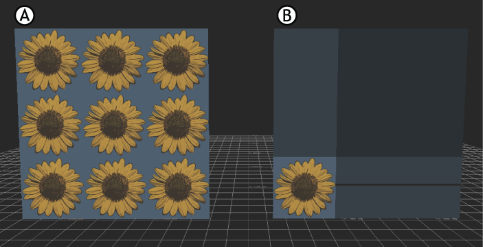 The same striped texture on two planes A. Texture set to U and V Repeat. B. Texture set to U and V Clamp.