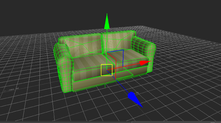 For example, in the following figure, a sofa is shown in the Viewer window with Translation arrows, representing each axis. If you select one of the arrows and move the mouse in a direction, the sofa is translated along that axis.