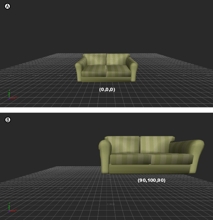 Viewer window A. Sofa’s position at the center of the 3D world (0,0,0) B. Sofa’s position at (90,100,90)