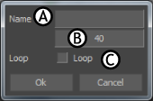 The Mark dialog box A. Name field B. Time code field C. Loop option