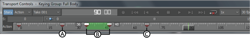 | Loop | Loops between the current and previous mark. If there is no previous mark, the Action timeline loops from the beginning of the take to the current mark. When Loop is disabled, the take stops playing at the mark. |