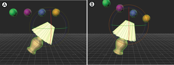 In this mode, Rotation rings appear only on the manipulation point object, and as you rotate, the other objects in the selection rotate around it.