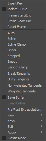 The FCurves context menu displays additional options for setting keyframes and function curves. To display this menu, right-click anywhere in the Fcurves pane.