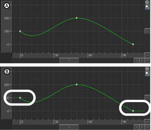 Extrapolation A. Function curve without extrapolation. B. The function curve after extrapolation, with both extrapolation modes set to Constant. The extrapolated regions appear as dotted lines (circled).