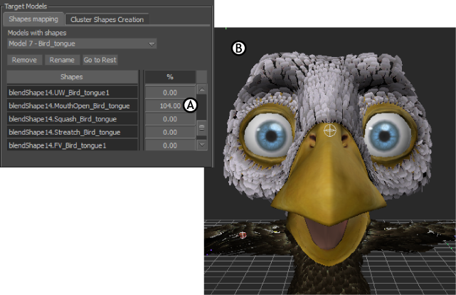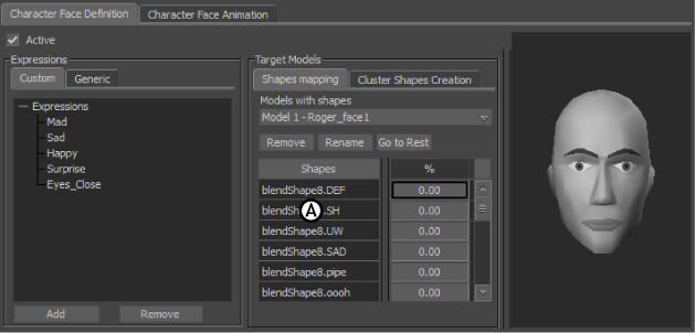 Character Face Settings A. Shapes Mapping pane B. Models with shapes menu C. Shapes list
