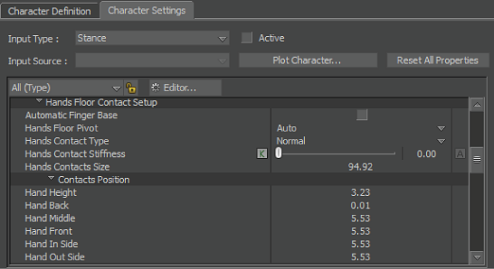 In the Floor Contacts group of character properties, the Hands Floor Contact Setup folder let you adjust how hands make contact with the floor.