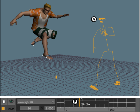 In the following figure, the track’s ghost (A) displays for Pose A beside the rendered figure of another track. The frame number on Pose A indicates that the pose is selected. The line of the pose is the same color as its ghost.