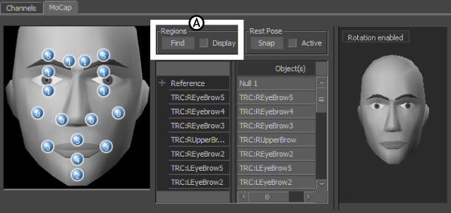 After setting up the Marker Set list, use the Regions area to define the zone of movement for the model’s main facial components. The Regions area is available only when the Active option in the Rest Pose area is disabled, and consists of the Find button and the Display option.