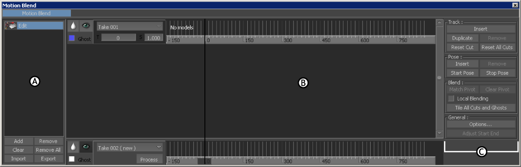 Motion Blend window A. Edits pane B. Track list C. Motion Blend Options pane