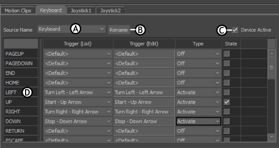Keyboard pane A. Source Name field B. Rename button C. Device Active option D. Controls list
