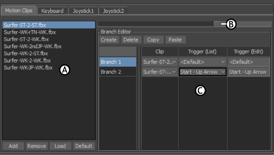 Motion Clips pane A. Motion Clips list B. Activity Progress bar C. Branch editor