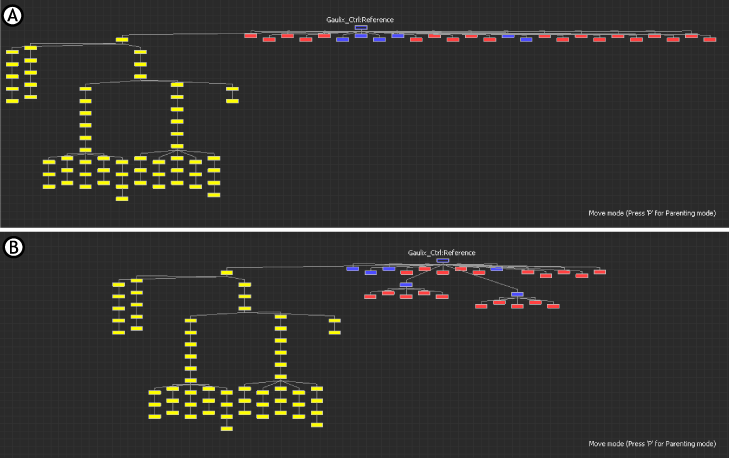 A. Basic Control rig hierarchy B. Control rig customized with re-parenting