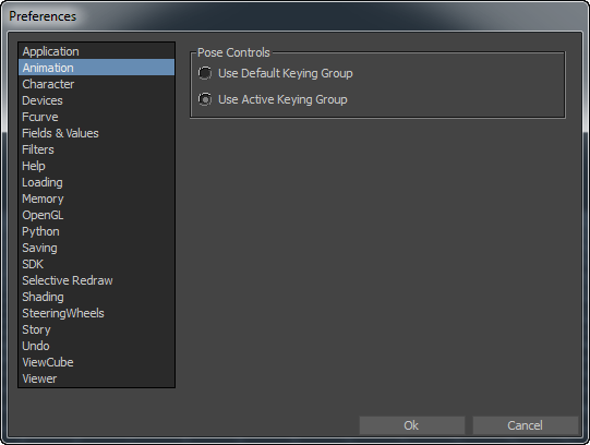 Note: When you create character poses, the keying group defaults to “Full Body”. When you paste character poses, the keying group is always the active keying group. The choice between the “active” or “default” keying group setting applies to the creation of object poses.