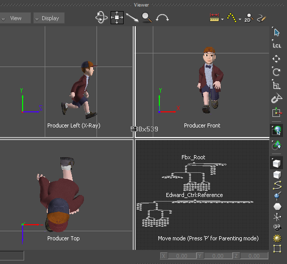 Each pane can use a different camera view, so you can view your scene from different perspectives at the same time. You can also show the Schematic view in any of the Viewer window panes.