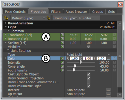 Context Keying Modes A. Light-blue properties receive keyframes B. Color property is selected and can also receive keyframes