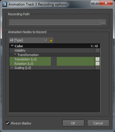 The properties shown in the Track's Recording option dialog are the properties that can be animated and therefore recorded.