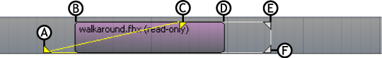 Points of a clip A. Still In point B. In point C. Fade In point D. Out point E. Fade Out point F. Still Out point