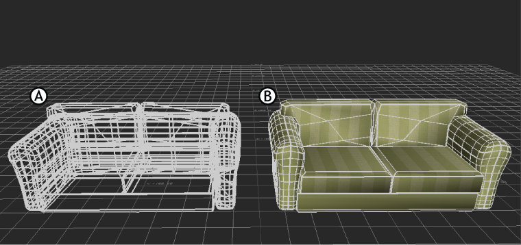 Wire Frame shader A. Replaced Default shader on sofa B. Appended to sofa