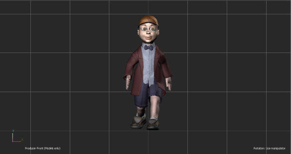 Shows the scene with the XY plane defining the grid . The X-axis is left and right, and the Y-axis is up and down. The Z-axis points toward the camera. This camera view lets you translate an object along the X and Y planes only. You can zoom and pan, but you cannot orbit.
