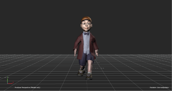 Shows the scene with the XZ plane defining the horizon . The Z-axis faces the camera, and continues towards the horizon, the X-axis is left to right, and the Y-axis is up and down. This camera view lets you translate an object on all three planes, and lets you zoom, pan, and orbit.