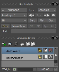 An animation layer (AnimLayer1) is created and shown as the active layer in the Key Controls window and in the Animation Layers window.