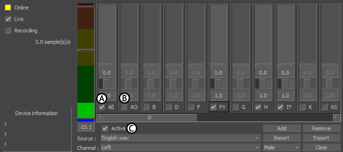 Voice device settings A. Sound parameter activated B. Sound parameter disabled C. Active option