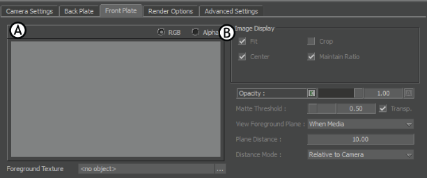 Similar to the Back Plate pane, the Front Plate pane lets you select a texture (containing either an image or video clip) to appear in the camera view, but for the camera’s foreground plane.
