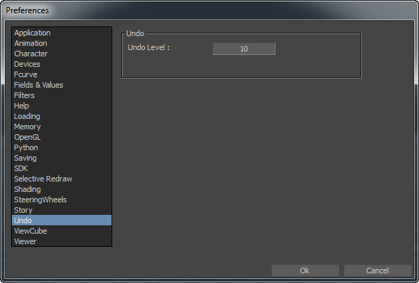 The Undo Level value lets you set the maximum number of “undos”. You may want to reduce the number of undo levels to save memory and speed up MotionBuilder. The default Undo value is 10.