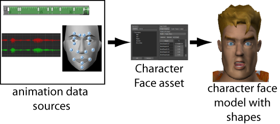 The Character Face receives motion capture, audio data, or keyframe animation and uses the Generic and Custom expressions to animate the appropriate shapes on the head model.