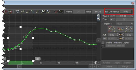 You can scale and manipulate keys by adding and setting falloff values on FCurves. Setting a Fall Off Radius value creates falloff, in frames, on both sides of a selected area of an FCurve. For example, setting Fall Off Radius to a value of 10 creates 10 frames of fall off before and after the selected area.