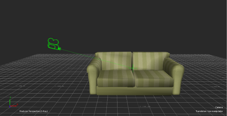 The camera interest is always placed at the center of the scene. The camera is shown with a dotted line that ends with a “+” (Cross) symbol.