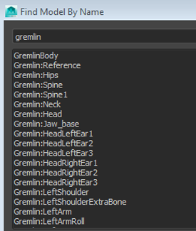 You can search for nodes in the scene by typing a name into the Find Model By Name search area. MotionBuilder generates a list of search results based on the search term you type.