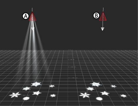 For example, the following figure shows two lights, one with Draw Volumetric Light activated and one with Draw Volumetric Light disabled. If you set Fog Intensity to 0, the Draw Volumetric Light settings have no effect.