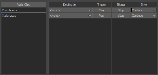 The file path and name of loaded sound files appears in the Audio Clips column. You can specify a .wav file by typing the file name and path in the Destination field. The default entry <None> means that no destination is specified, and the path is taken from the Audio Clips column entry.