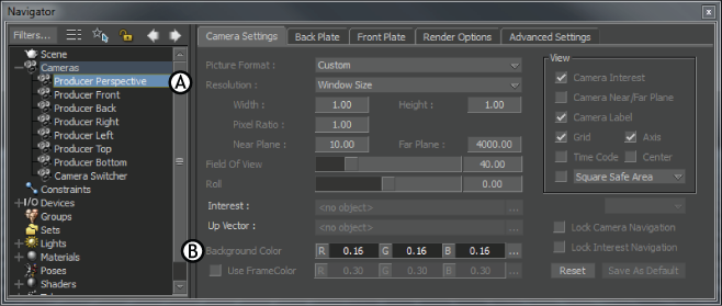 Navigator window A. Current camera selected in Scene browser B. Background Color settings in Camera Settings pane