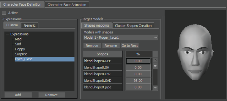 Note: When the Character Face Definition pane Active option is enabled, you cannot preview or define facial expressions on the model in the Viewer window.