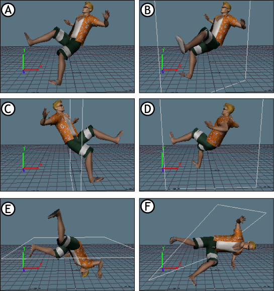 For example, the following figure shows the effects of pasting a full body pose onto a character when the various mirror plane modes are active. The pose in the following figure A is the original pose. The right side of the character is mirrored onto the left side, and the orientation of the character changes as each mirror plane mode is used.