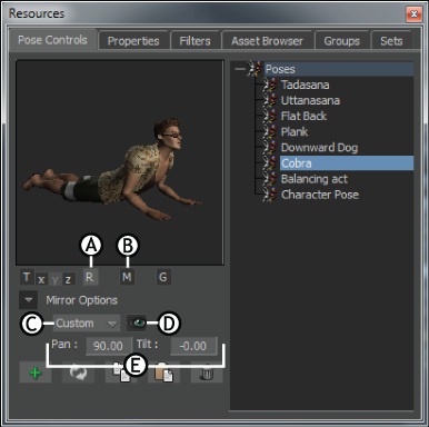 Mirror Mode menu options A. Original pose B. Auto Mirror mode C. Z-Y plane D. X-Y plane E. X-Z plane F. Custom plane, with Pan and Tilt values of 50