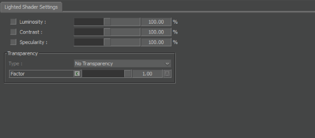 The Transparency Factor slider lets you manipulate or animate the Transparency value for the Lighted shader. The default setting is 1.00.