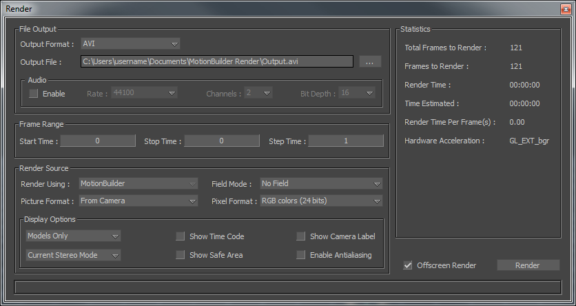Note: If your current video buffer mode does not support an Alpha channel, a warning message appears each time you open the Render window. Click Hide this Message if you do not want this message to appear again.