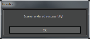 The selected segment of the scene is rendered into the format specified in the Output Format menu and saved to the destination specified in the Render window Output File field. A window appears to tell you the scene has rendered successfully.