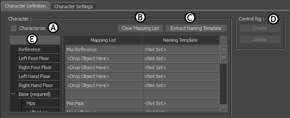 Character Definition pane A. Characterize option B. Clear Mapping List button C. Extract Naming Template button D. Control Rig area E. Mapping List