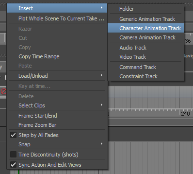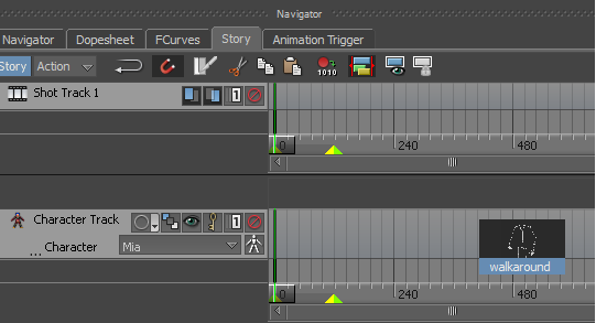 After framing the Walkaround clip, the Character Track is highlighted in blue indicating it is selected, and the Walkaround clip is no longer shown as being selected.