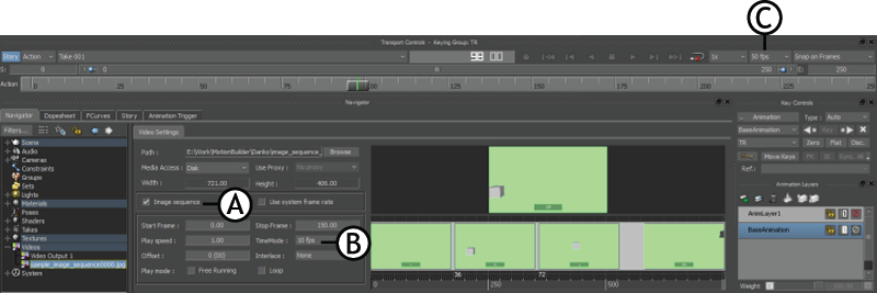 Transport Controls window and Video Settings tab A. Image sequence checkbox B. Custom frame rate (10 fps) C. Frame rate in Transport Controls window