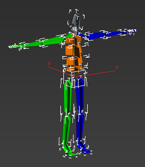 The skeleton and biped are positioned in a “T” stance, the pose used by animators for skinning.