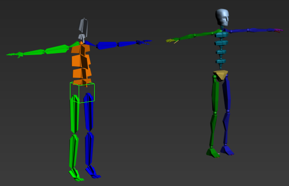 Conventional 3ds Max bone system skeleton and 3ds Max biped